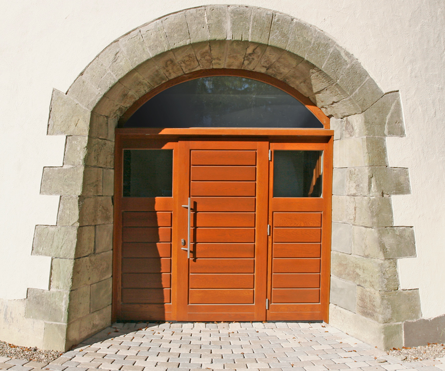 Haustüranlage aus massiver Eiche, eingebaut in einem ehemaligen Mühlenturm.